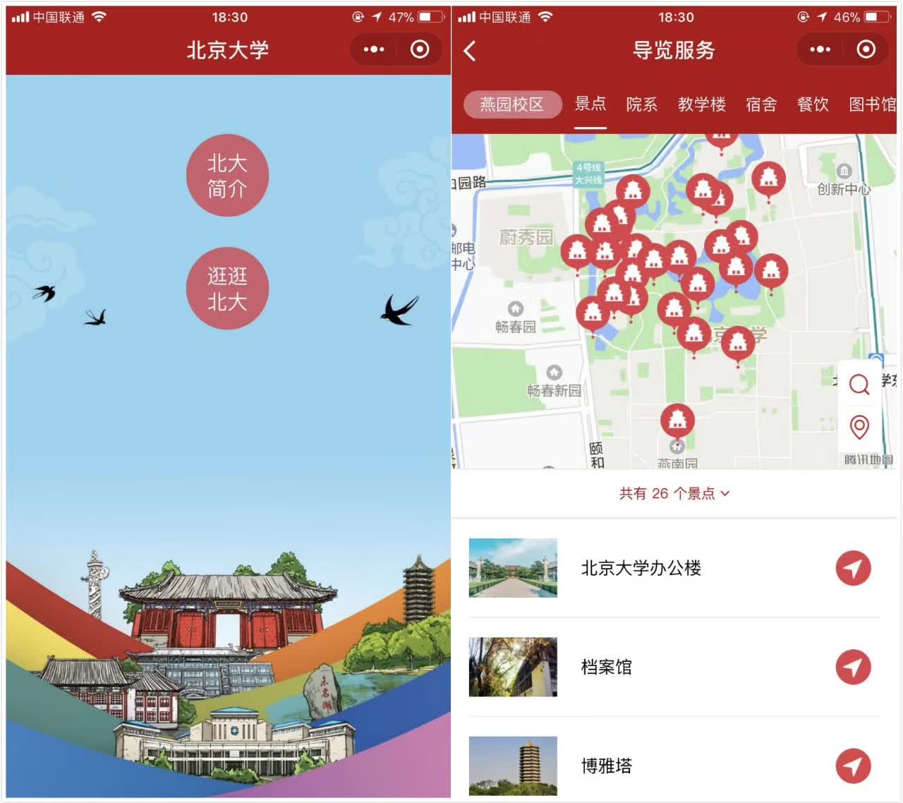 这类小程序主要提供高校介绍、导游功能。比如北京大学关联的官方导览小程序“北京大学导览”,北大的景点、院系、教学楼、宿舍、ATM机甚至卫生间的位置,都有地图标识。