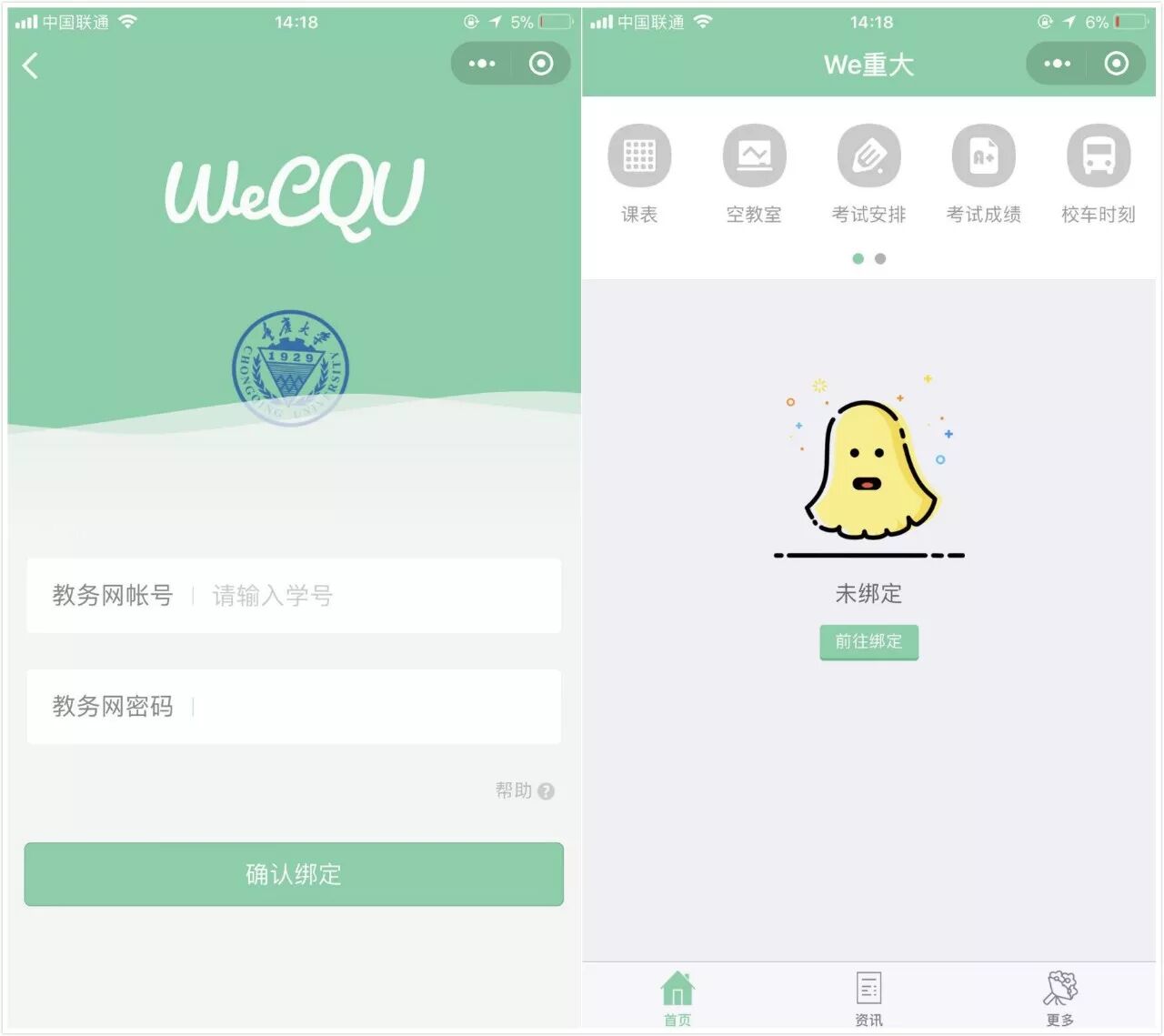 举个例子,比如重庆大学学生会的官方公号绑定的小程序“We重大”,其中就包含课表、空教室、考试安排、考试成绩、校车时间、寝室电费、借阅信息等查询服务,以及校内资讯。