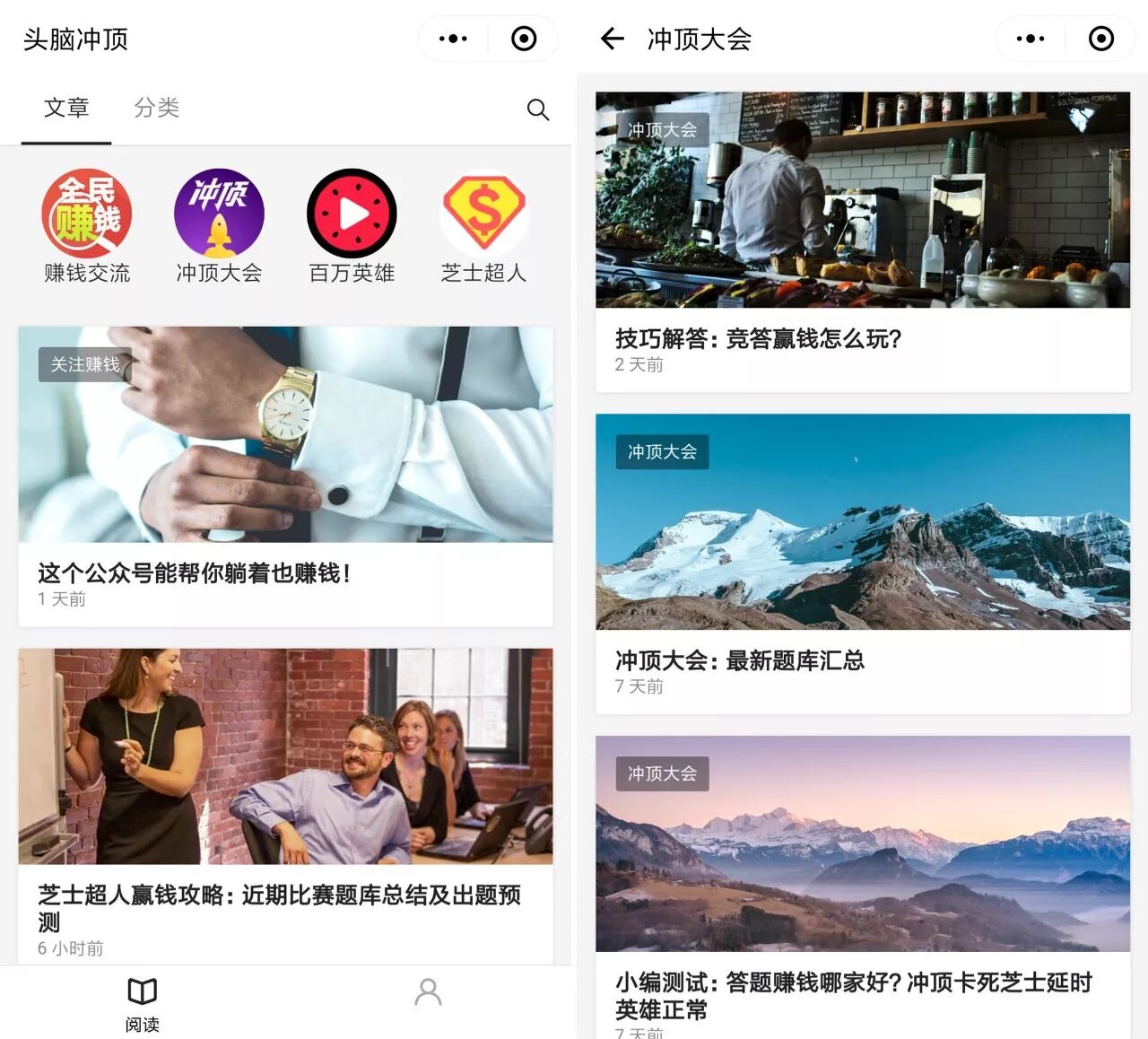 目前有两个答题直播小程序,“脑力冲顶”和“百万黄金屋”,可以说是第一波追着风口跑的答题直播小程序了。