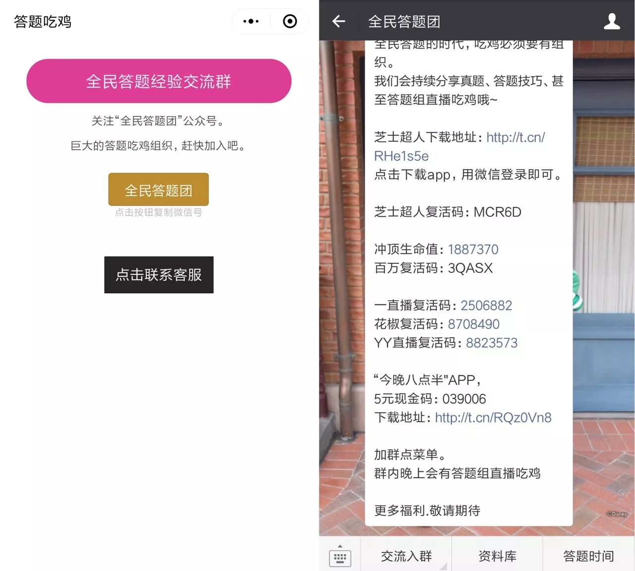 “冲顶大会群团”的设计简直可以用简陋来形容。小程序只有一个核心功能——引导用户关注公众号“全民答题团”。在公众号里,还有交流QQ群、资料库和每日答题时间的入口。
