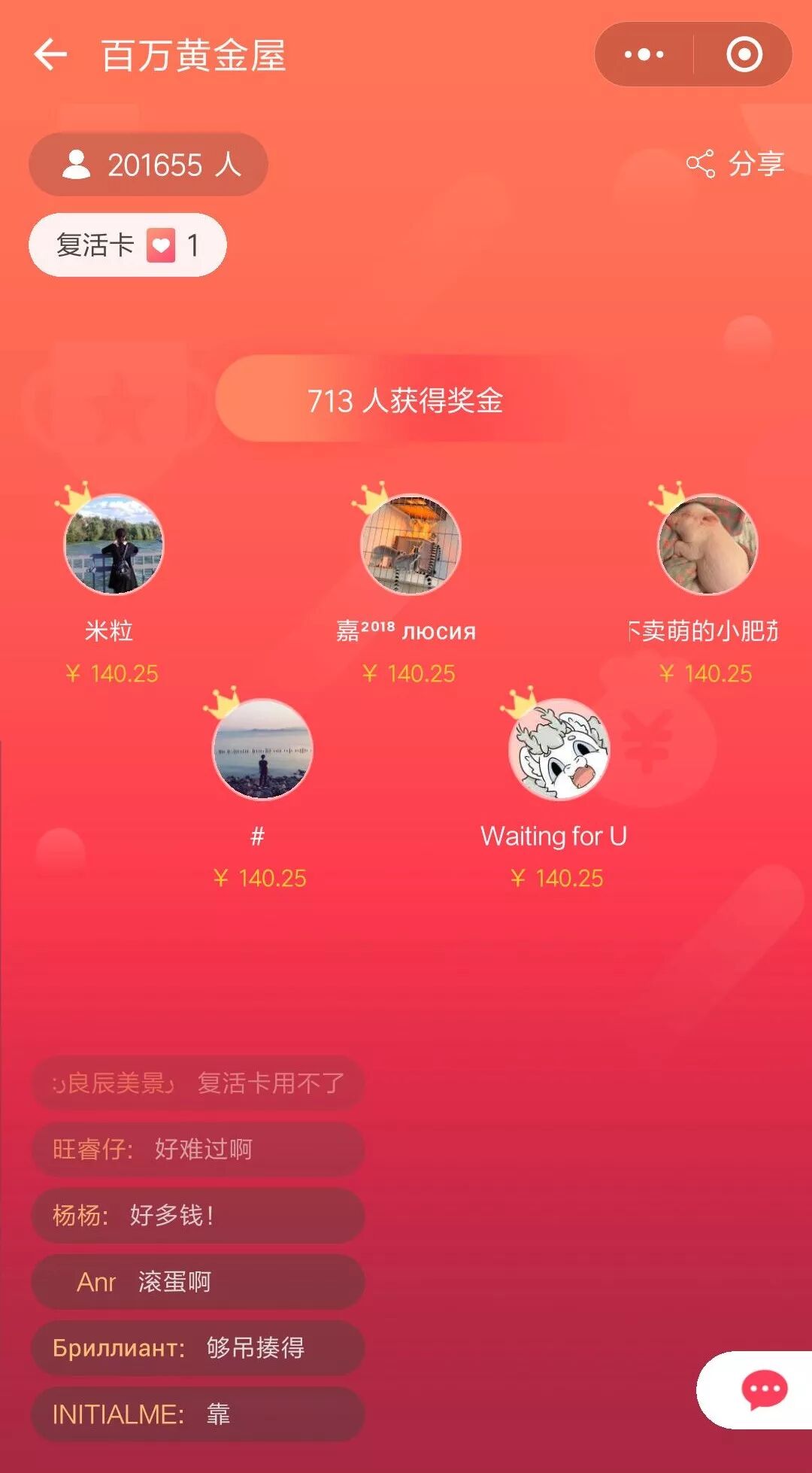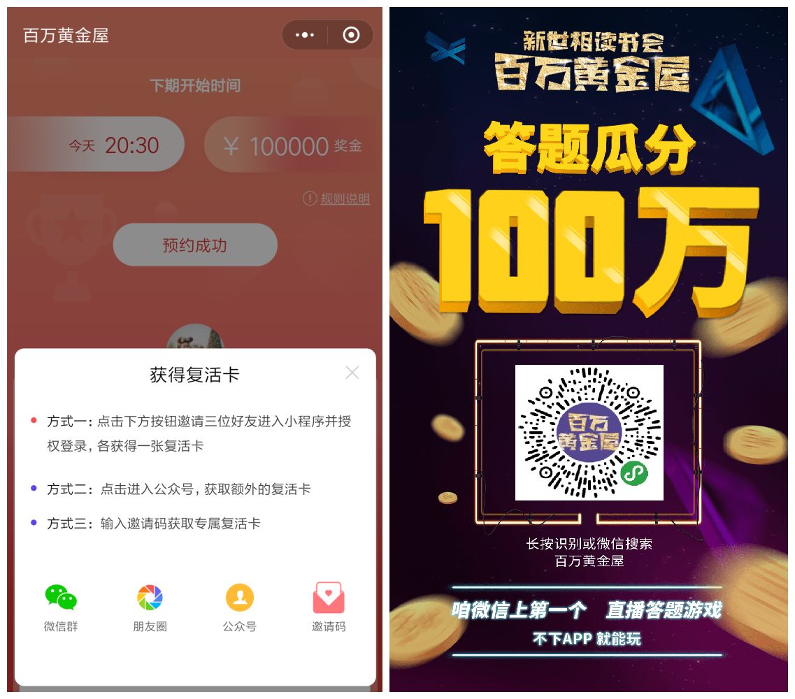 “百万黄金屋”则是新世相推出的答题直播小程序。和“脑力冲顶”相比,奖金有10万,真是大手笔了。