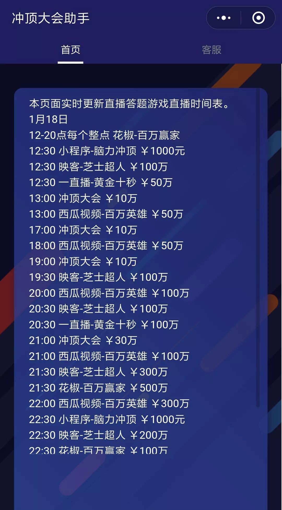 “脑力冲顶”和“冲顶大会助手”是同一个开发公司。“冲顶大会助手”提供每天答题直播的时间和奖金,方便用户查看、选择。“冲顶大会助手”中也预告了“脑力冲顶”的活动时间,不过1000元的奖金在动辄上百万的奖金中略显寒酸。