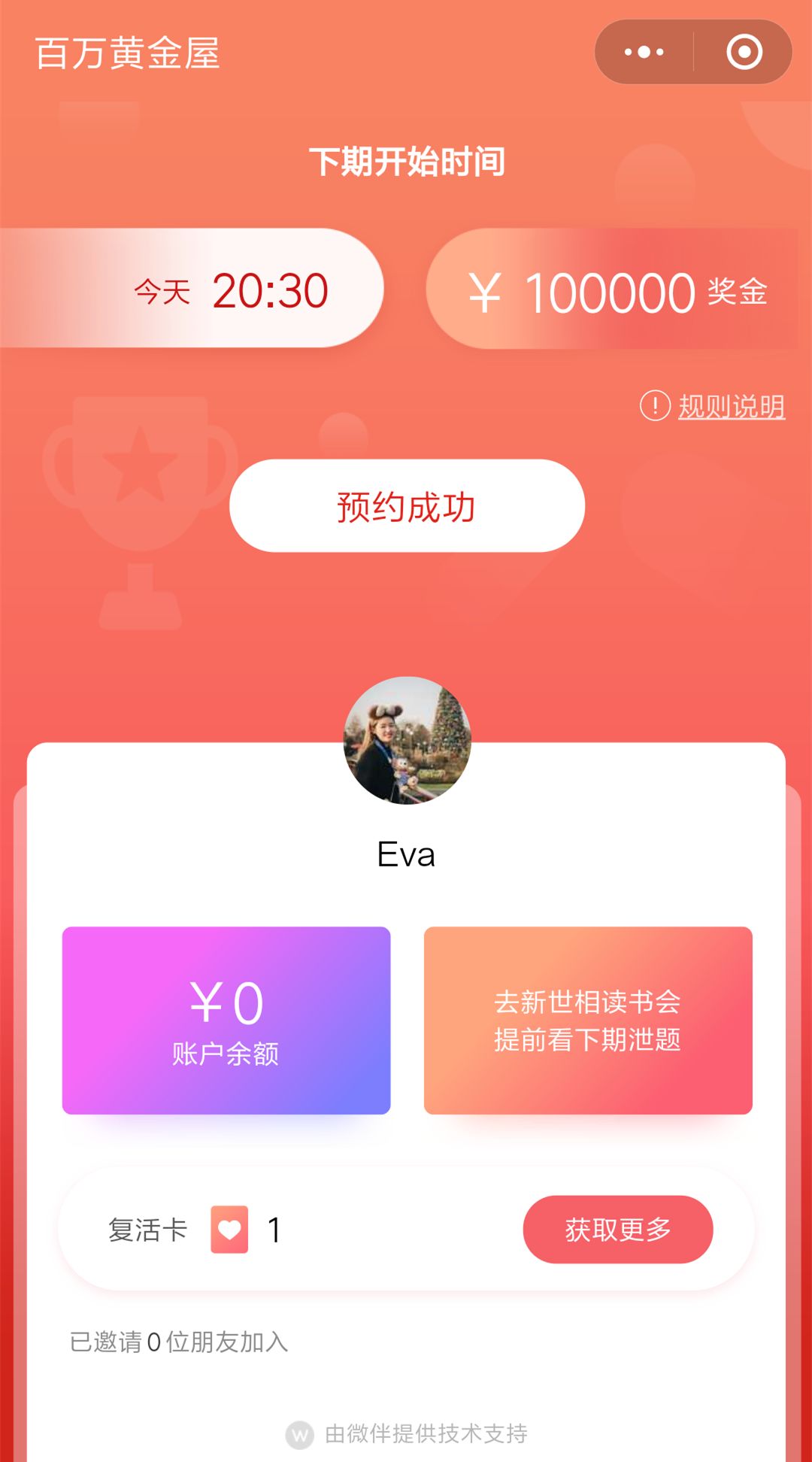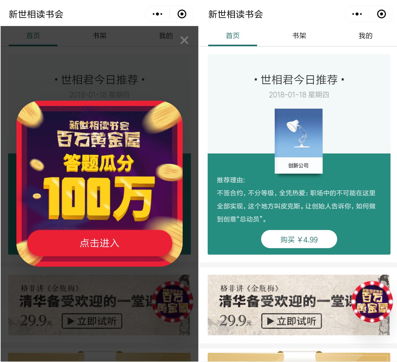 不过,答题时最怕的不是没有复活卡,而是根本不知道问题的答案。在“百万黄金屋”中,竟然有提前看下期泄题的入口。点击进入,就跳转到了小程序“新世相读书会”。