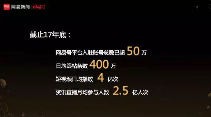 再来看看另一组数据,目前网易号平台的短视频日均播放量已达4亿次,资讯直播月均参与人数达2.5亿人次。