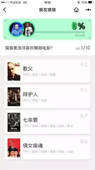 用户从40个电影里选10个,让朋友猜最喜欢的是哪十个。但有时用户会发现,那些不熟悉的人反而是灵魂知己,结果造成了很多分手的惨剧,但有时也带来了很多意外惊喜。
