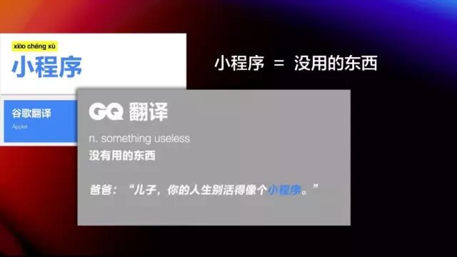 更有趣的是蔓延到了非创业圈。GQ做了一个翻译,小程序的翻译是什么呢?Google翻译是applet,GQ则认为是useless。