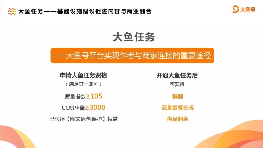 今天主要想跟大家分享一下大鱼任务,包括它的申请资格,对于内容指数、粉丝量的要求,以及开通以后它可以享受到稿筹、流量套餐分成和商品佣金。