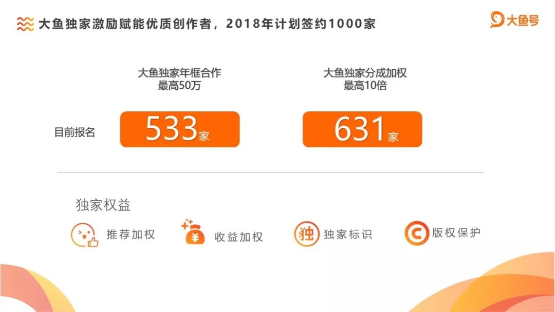 下面想重点跟大家分享一下,也算是一个提前的预热,因为很快我们就会推出大鱼奖金、大鱼独家新规则的发布,我们会更偏重于服务优质创作者,让优秀创作者脱颖而出。