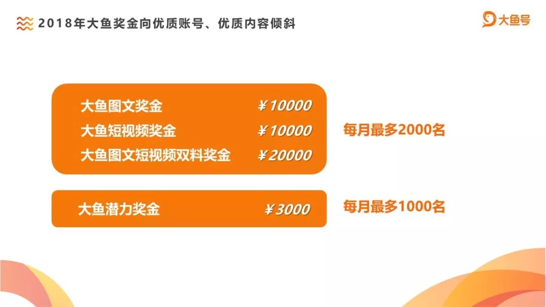 其实这个想说明的是,头部内容创作者在平台绑定得非常深,同时他的内容也更好的获得了读者和用户认可。在2018年1月,我们对大鱼奖金进行了升级,增加了大鱼潜力奖金,也是为了鼓励更多的内容创业者创造好的内容,我们来提供奖金激励方面的支持。这个月大鱼奖金的规则会向优质创作者倾斜,大家很快就会看到公告,我们会对优质内容创业者进行自动报名邀约。
