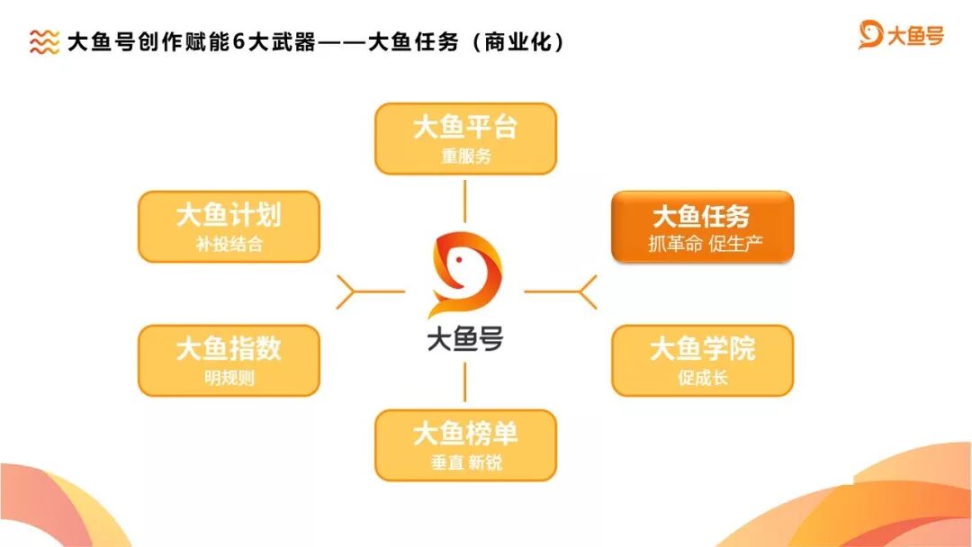 大鱼号成立的时候有6大赋能武器,大家可以看到大鱼学院、大鱼榜单、大鱼指数、大鱼计划、大鱼平台,这6大武器。