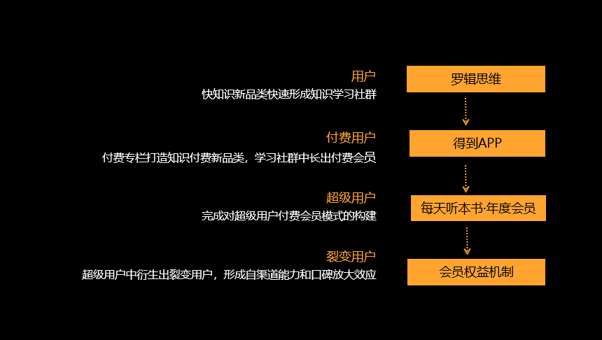 以得到为例,举例来说,罗辑思维订阅号、李翔知识内参的用户,我们可以叫做普通用户;得到App付费订阅的专栏,还有大师课,比如说199元的订阅专栏,大师课99元,精品课是9块9,我们将这种定价体系上比较完整的方式称为付费体系、付费用户。再看“每天听本书”,可能就是我们讲的年度会员、超级用户的模式。2018年,超级用户思维将变得特别重要。现在我们就可以理解知识服务赛道对于头部IP的收割。