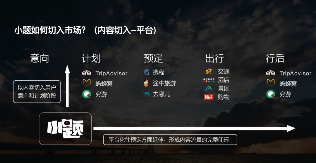 当用户有预定需求时他可以想到携程,当用户有完善攻略的时候会想到蚂蜂窝,当用户产生旅游想法的情况下有没有可能想到小题所做的事。我们能不能给予用户一个真实、可体验的旅游场景,让用户在想要旅游消费的时候能够率先简单去做决策。