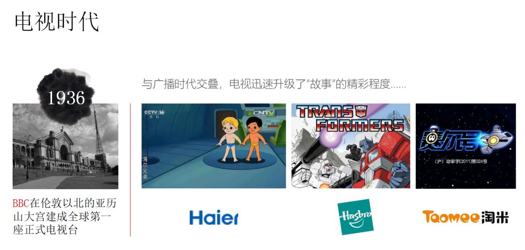 到了电视时代内容营销就更加精彩,1936年BBC在伦敦以北的亚历山大宫建成全球第一座正式电视台,后来海尔兄弟登陆了央视。在互联网时代更不用讲了,现在应该有3000万个微信公众号,大家都在做内容营销的故事。