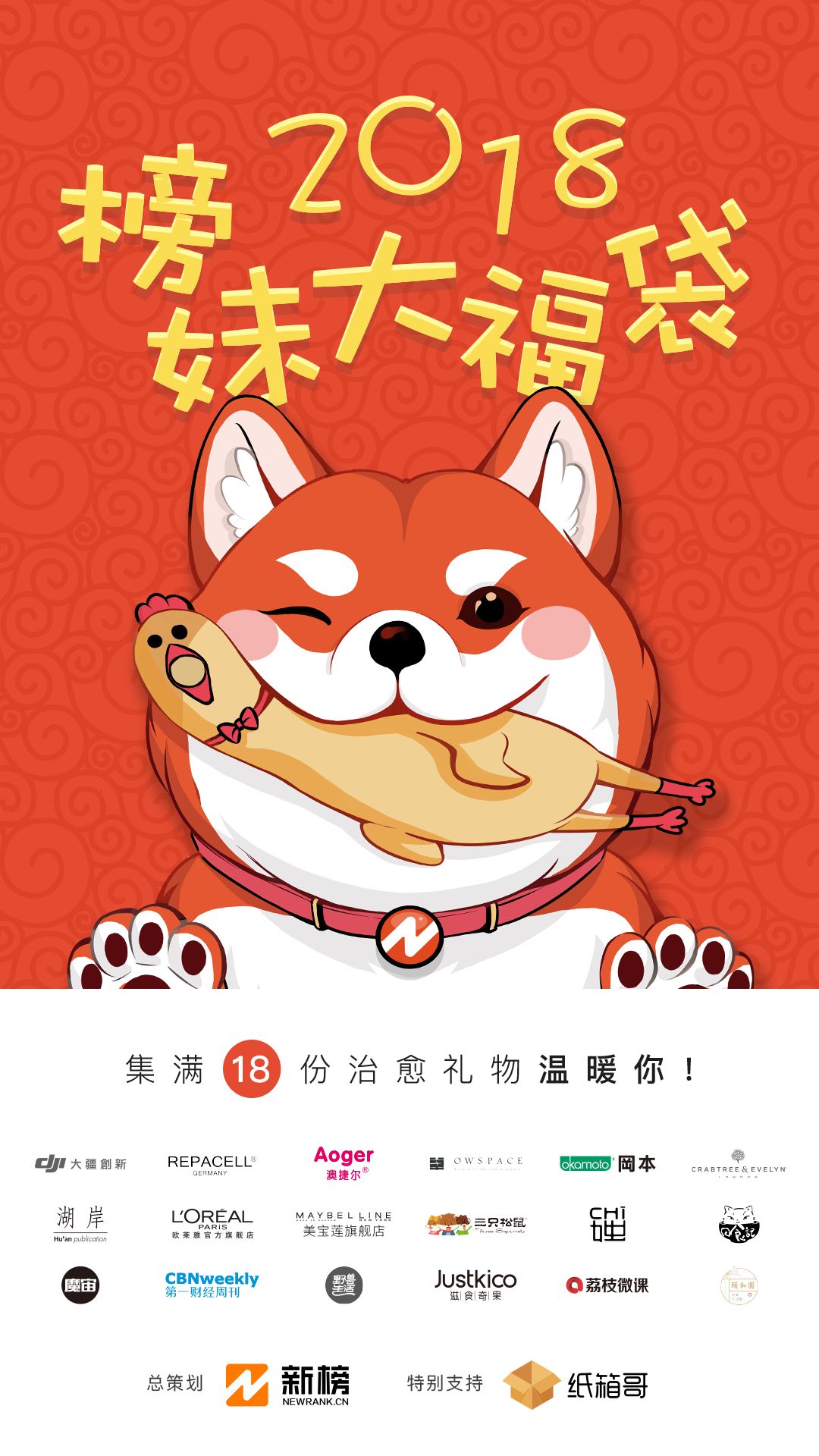 每份榜妹大福袋中包含18样礼物,由DJI 大疆创新、Repacell 瑞铂希、Aoger 澳捷尔、OWSPACE 单向空间、冈本、Crabtree & Evelyn 瑰珀翠、Hu’an publication 湖岸出版、L’ORÉAL PARiS 巴黎欧莱雅官方旗舰店、MAYBELLINE 美宝莲官方旗舰店、三只松鼠、深夜发媸、日食记、魔宙、第一财经周刊、野兽生活、Justkico 滋食奇果、荔枝微课、颐和园皇家生活馆 18家品牌倾情提供,榜妹在此谢过啦!同时也非常感谢纸箱哥的特别支持!