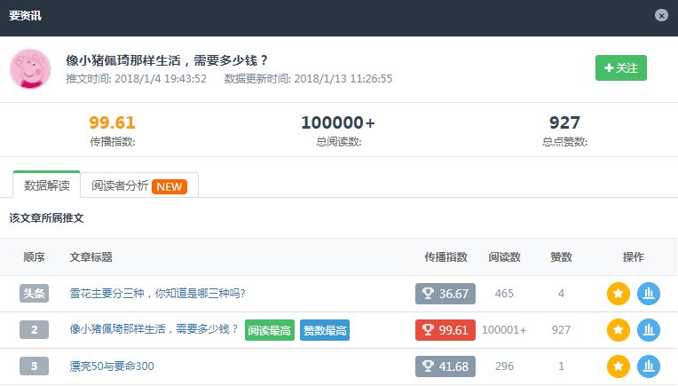 写文章最重要的是抓住当下人们的痛点,而钱是驱动力之一,围绕这类的文章不少能获得理想阅读,如文章《像小猪佩琦那样生活,需要多少钱?》在1月初引爆朋友圈。