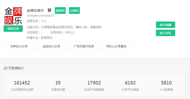 这个公众号是娱乐性质比较强的号,而且从往期数据来看公众号黏度较强,平常头条平均阅读是一万以上,该公众号推送多篇和贾乃亮相关的文章皆获得10W+阅读数据。