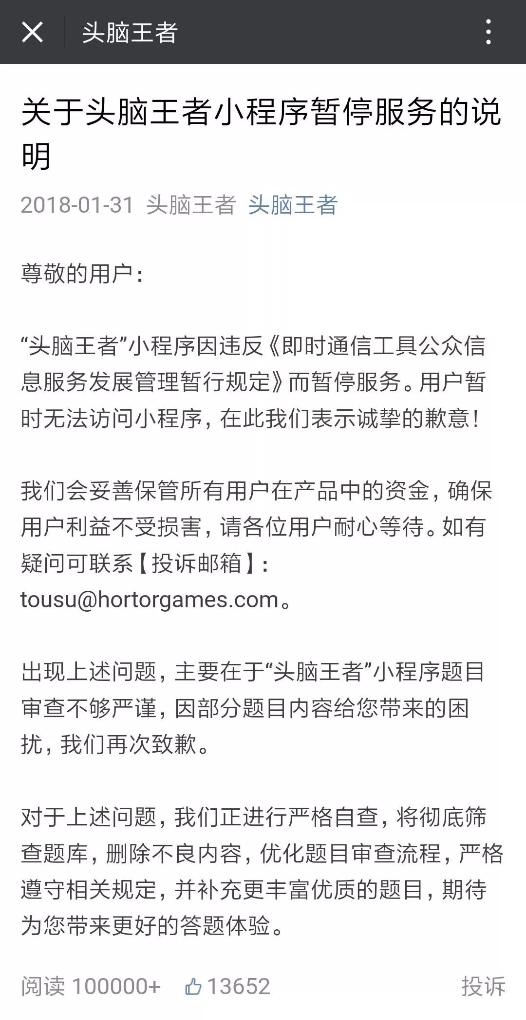 今天凌晨,公众号“头脑王者”发布说明回应,称被封原因是小程序题目审查不够严谨。