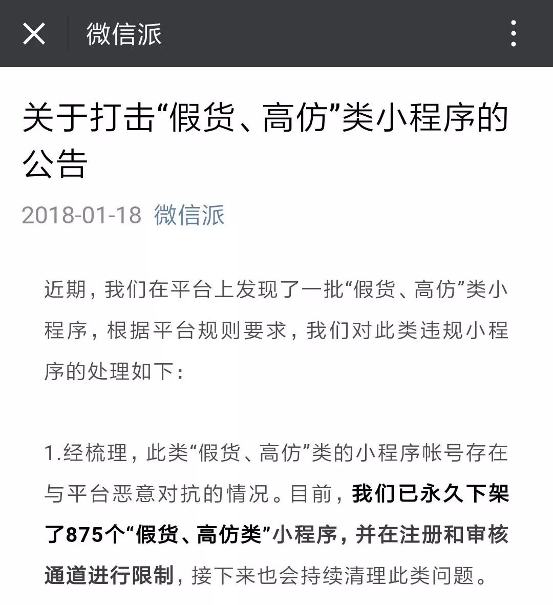 1月18日,“微信派”发布公告,微信团队永久下架了875个“假货、高仿类”小程序,并在注册和审核通道进行限制,接下来也会持续清理此类问题。