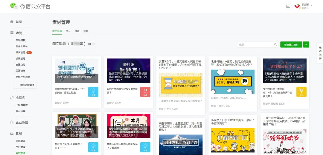 1月9日,登录微信后台时发现,自12月后台大改版以来的“素材管理”页再度优化,此前每行仅能展示3条图文,优化后,每行展示图文数可根据页面大小自适应变化。