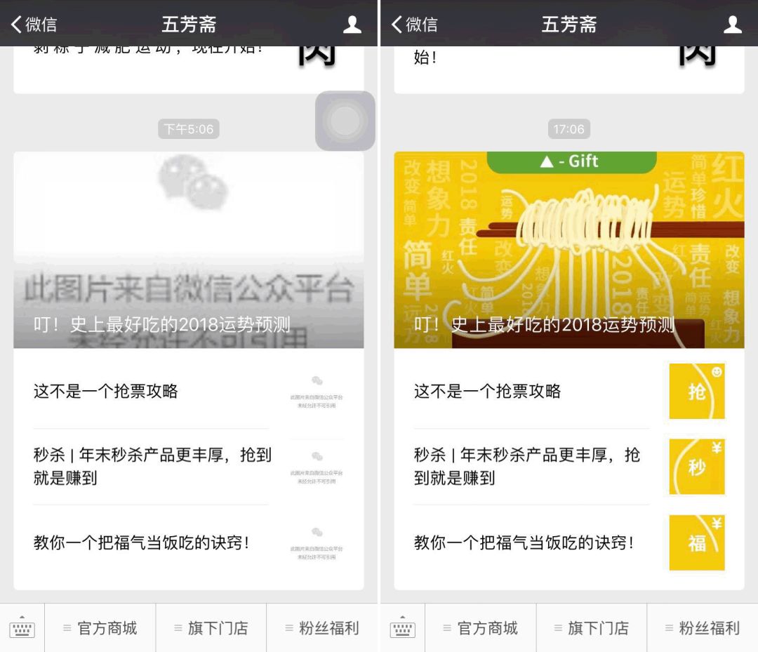 而同一个账号在不同手机的显示情况也不同,比如公众号“五芳斋”: