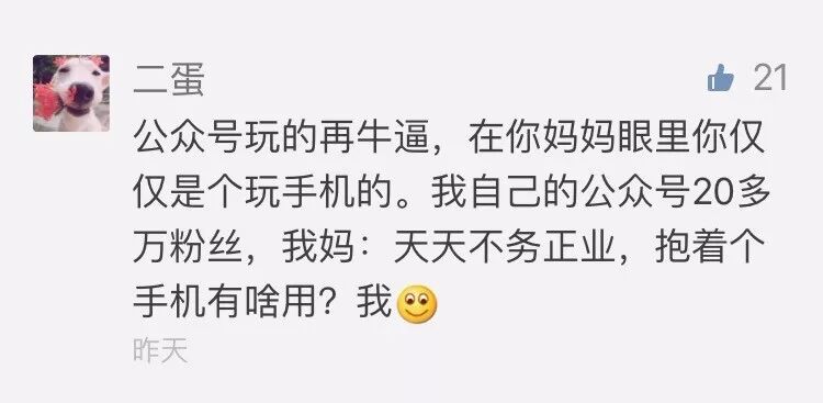 爸妈还好,现在亲戚都怀疑我贩毒。我不管怎么跟他们解释,都不能理解为什么公众号能赚到(这么多)钱。所以我现在准备不解释了,直接说我贩毒,免得人家猜我在卖淫……