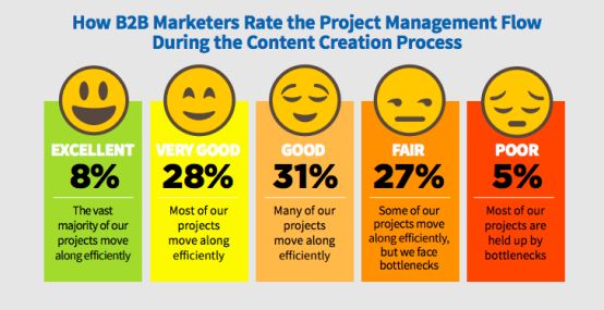 与36%的受访者和14%最不成功的营销人员相比,有70%的表现卓越的营销人员表示,他们团队在创建过程中的项目管理是优秀的或是非常好的。