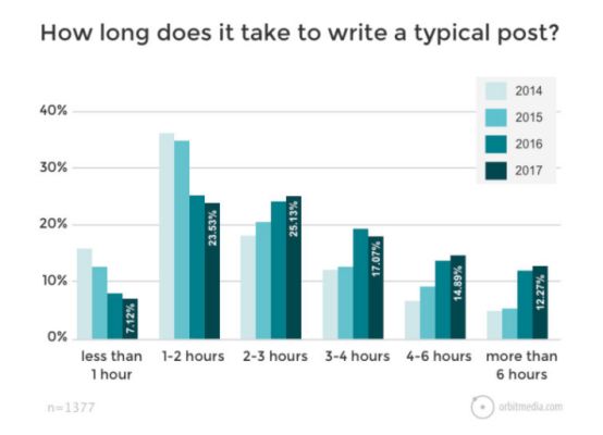 根据Orbit Media的数据,2017年,内容生产者在每个帖子上花费的时间比前几年要多。