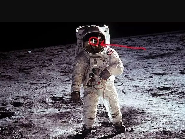 然而阿姆斯特朗并没有留下和月球的合影,这张全身照来自一起同行的奥尔德,奥尔德面罩上反射出来的就是阿姆斯特朗。