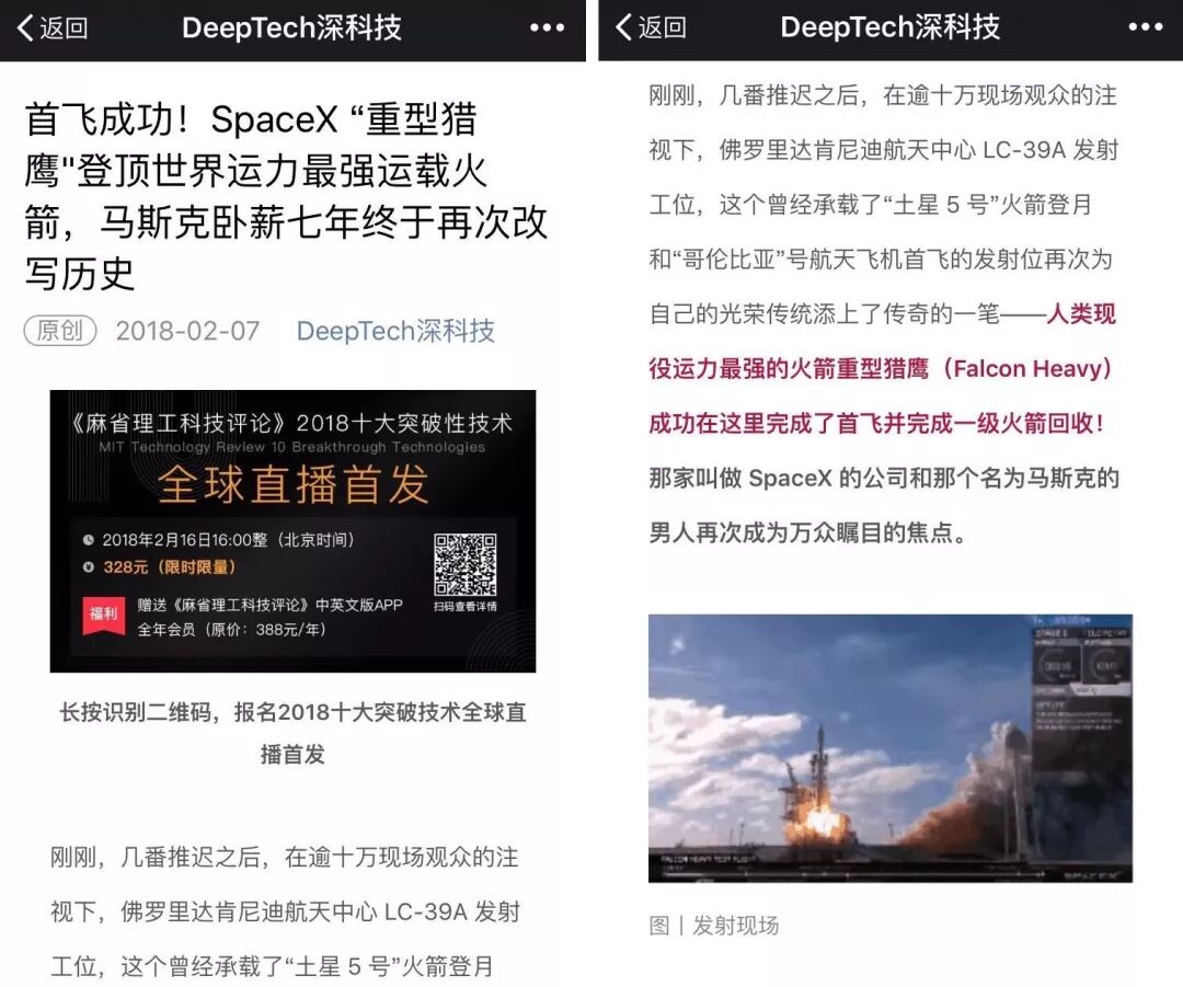 DeepTech深科技创始人周尔方告诉我们,“重型猎鹰”的发射本身是一件非常大的事情,“基本是马斯克这几年最牛的一件事”。而在内容上,团队也一直追求速度与深度兼得,“以做快讯的最快速度发布深度内容”。