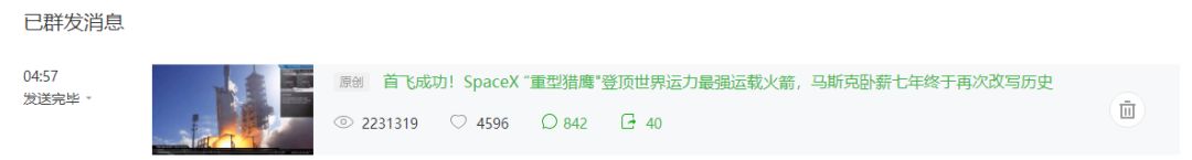 其中,“果壳网”于昨晚推文《凌晨2:30见分晓!这可能是有史以来最碉堡的火箭发射,或者最大的……烟花》,获20万阅读。