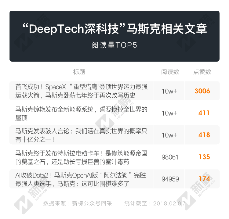 据新榜的“公众号回采”数据显示,“DeepTech深科技”从2016年至今一共有25篇10w+,其中关于马斯克的有3篇,还有两篇接近10w+。