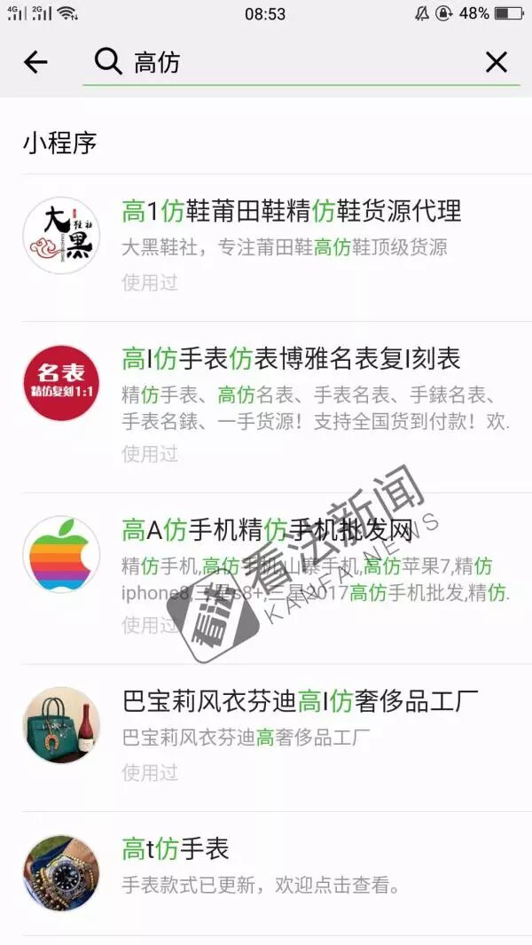 1月17日,法制晚报记者披露微信小程序内假货泛滥,搜索“高仿”、“精仿”,显示出185个结果,小程序的开设者多为假货销售者,以假表、假包、假鞋和仿名牌服装为主。小程序店主称所售商品是“超A”,要做长期生意,并称大都只做微商,不开淘宝店。