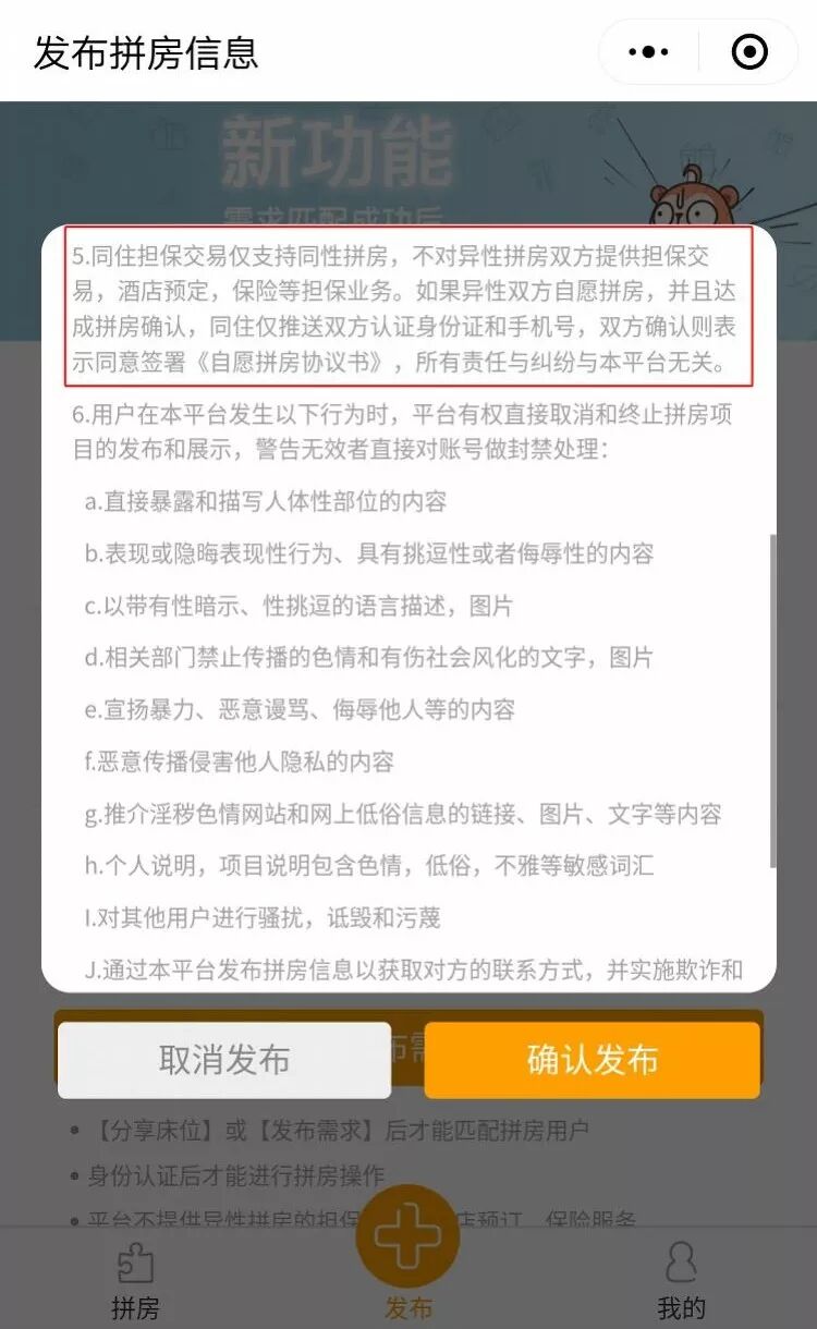 如果异性双方自愿拼房,并且达成拼房确认,则表示同意签署《自愿拼房协议书》,同住仅推送双方认证身份证号和手机号,所有责任与纠纷均与平台无关。