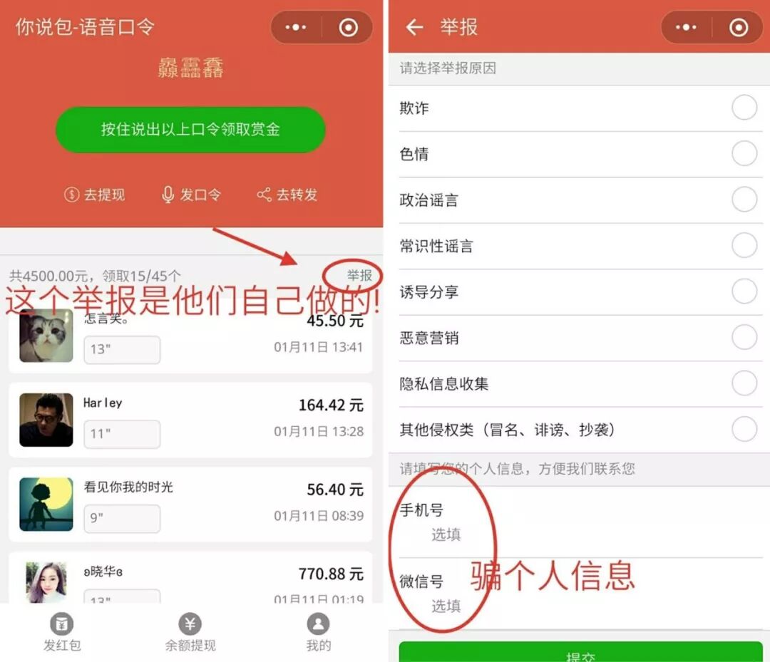 在知乎上,也有对小程序“你说包”是否涉嫌诈骗的讨论。知乎网友“莜陌”发现,小程序开发者还做了一个假的举报页面,骗取用户的手机号和微信号。