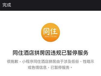 1月25日,小程序“同住酒店拼房”因涉及低俗、性暗示或色情信息被封。
