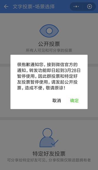 “投票帮”在用户发起群投票和特定好友投票时提示,“接到微信官方通知,转发功能即日起到3月28日暂停使用”。