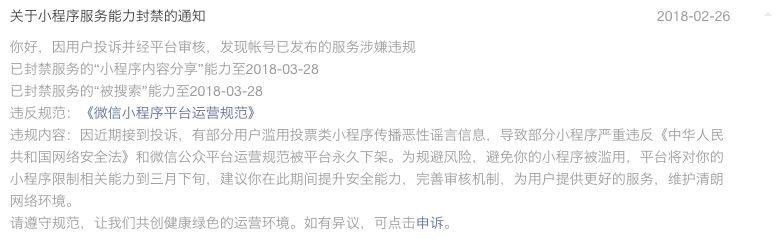 昨日,有小程序开发者在后台收到“小程序内容分享”和“被搜索”能力封禁的通知。