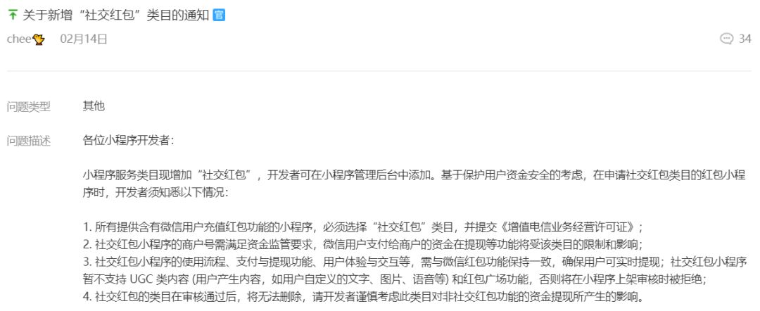 除了投票小程序和“头脑王者”被封,小程序官方2月14日发布的关于新增“社交红包”类目的通知中也提到,社交红包小程序暂不支持 UGC 类内容(用户产生内容,如用户自定义的文字、图片、语音等)。