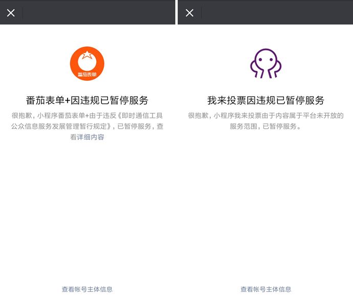 此外,还有多款投票小程序被封。“番茄表单+”由于“违反《即时通信工具公众信息服务发展管理暂行规定》”暂停服务。“我来投票”则因为“内容属于平台未开放的服务范围”暂停服务。