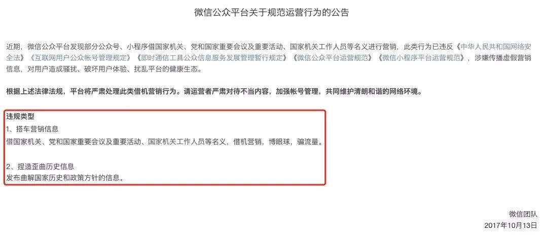 **需要注意的是:请谨慎写政治话题的热点,人民日报可以做领导人的H5,但咱们在文章里不能写,否则会被屏蔽。这是微信之前的一则通知: