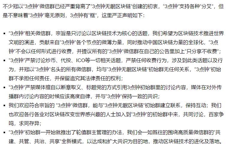 全世界“分叉”出若干个区块链微信群,2018年2月21日凌晨3点,“3点钟无眠区块链”初始群发布“3点钟无眠区块链微信群”共识声明。