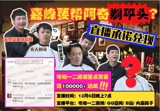三天后,点赞数真的突破了10万,团队如约在多个平台直播了“剃头”的壮举。