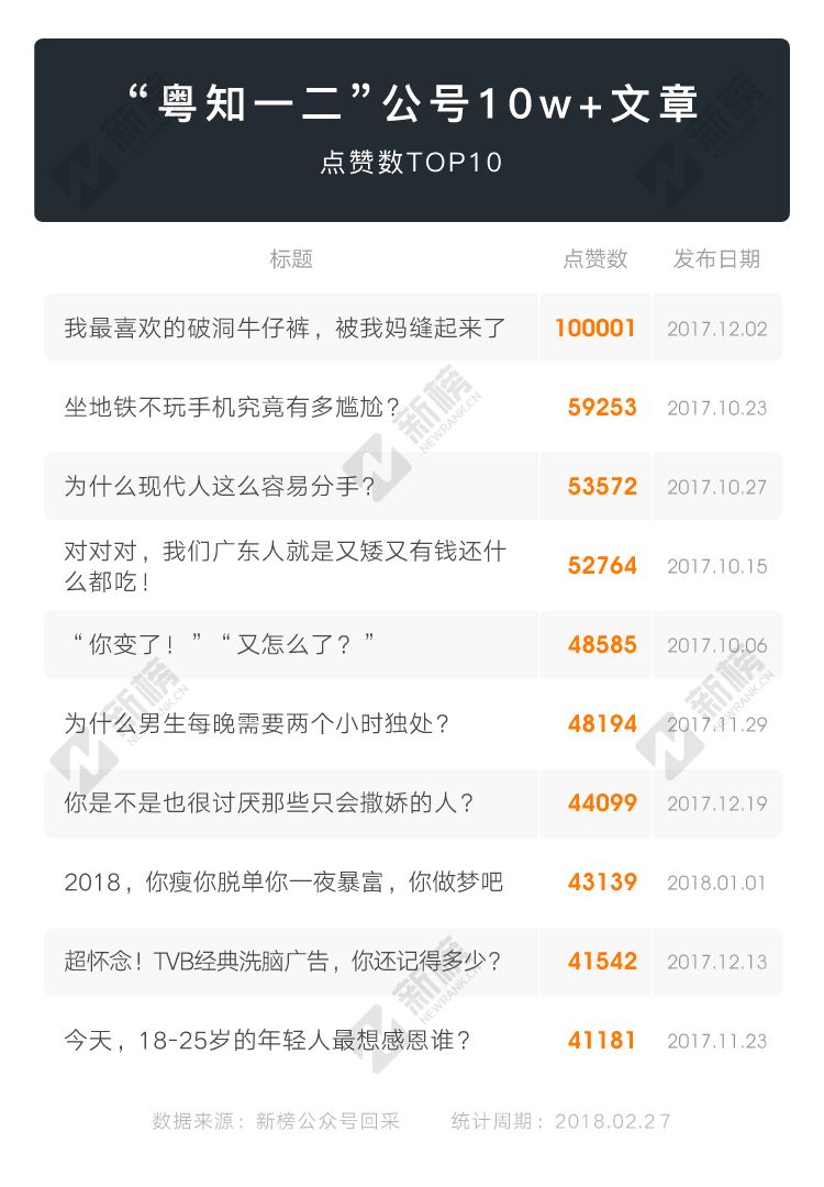 榜妹通过新榜的公众号回采,整理出了“粤知一二”的10w+推送中点赞数最高的10篇:
