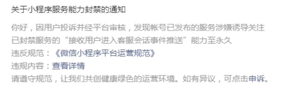 最近,有网友向榜妹爆料,因为利用客服消息引导用户关注公众号,被认为“涉嫌诱导关注”,封禁了“接收用户进入客服会话事件推送”能力。