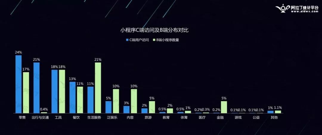 在去年上线的小程序中,阿拉丁统计平台对C端访问量和B端数量进行了对比,整体看零售 / 出行 / 工具 / 餐饮和生活服务是C端引入流量最高的应用场景,这里有个有趣的现象,B端数量多但C端访问量少的场景分别是:内容 / 泛娱乐 / 金融;而B端少C端多的则是:出行与交通 / 零售 / 餐饮。不可不说,后三种类型的玩家相对更能抢占到这波流量高地。从经纬系或其他优秀的玩家看:往往依托于高频的场景,刚需的工具,快捷的支付体验,更能吸引用户。