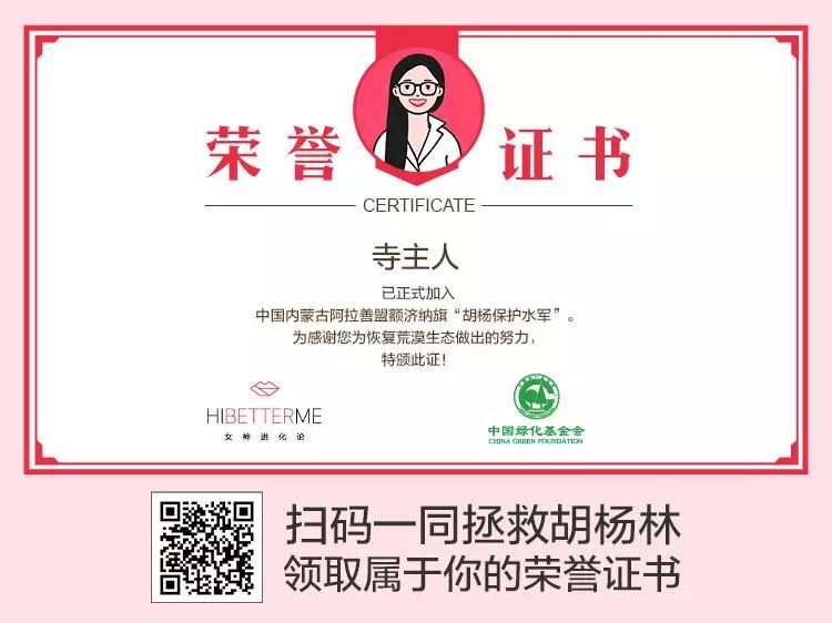 此前,女神进化论创始人寺主人曾受邀到中国内蒙古阿拉善盟额济纳旗参与项目探访。通过探访,她不但对当地的荒漠化情况有了深刻了解,更是被中国绿化基金会亲力亲为的举动所感动,从而提出利用自身新媒体平台优势及全网400万粉丝的影响力,与中国绿化基金协会一起,从策划到推广,以互联网思维带动民众参与公益,并且依据对女性用户的洞察力,设计适合女性参与及传播的H5思路,让一份荣誉与力量传递下去。