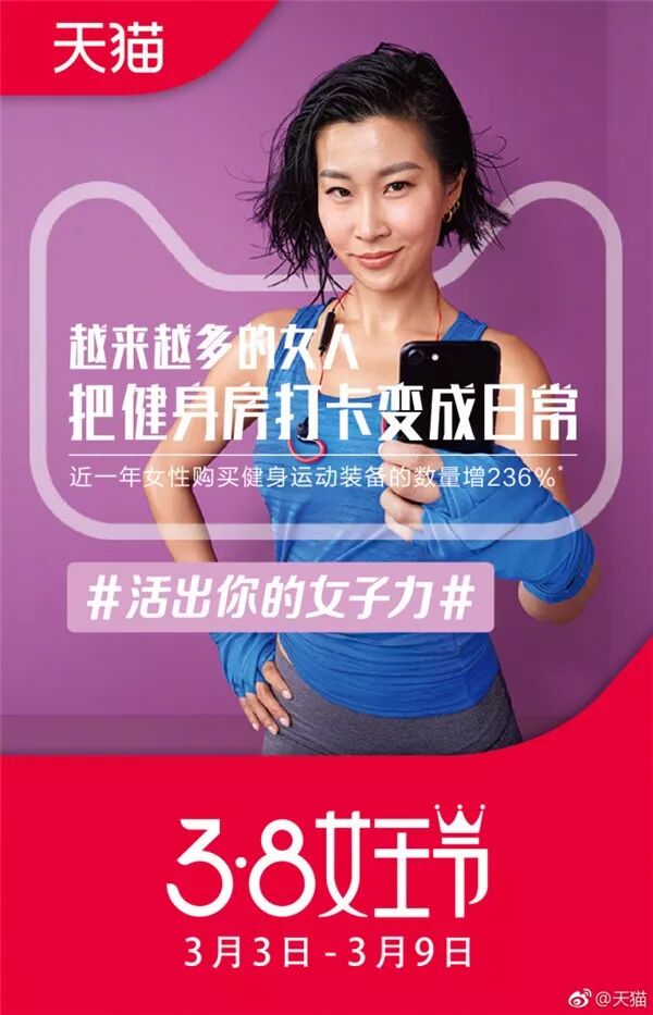 比如,上周刚刚结束的“三八妇女节”营销大战,天猫联合多家品牌一口气推出N个系列“女王节”主题海报,其中“活出你的女子力”系列就深得“隐藏需求分析法”的奥义:
