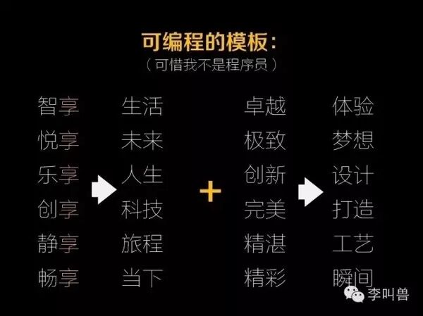 其实,参照之前李叫兽的文章《为什么你会写自嗨型文案》给出的X型文案编程表,可以发现,这些万能型Slogan就是把“高端”的词汇做了排列组合。