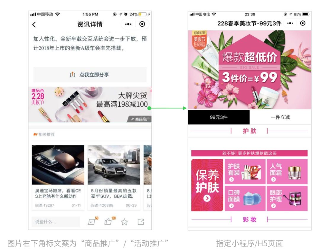 目前,小程序广告位只支持“品牌活动推广”和“电商推广”这两种类型,图片右下角会出现相应的 “活动推广”或“商品推广”字样。