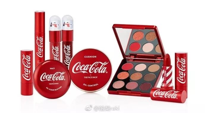最近,可口可乐与韩国美妆品牌the face shop合作,推出联名化妆品。有可口可乐款的气垫粉、眼影、唇膏及唇彩等。彩妆包装通体为可口可乐的经典红色,上面印有可口可乐的logo。
